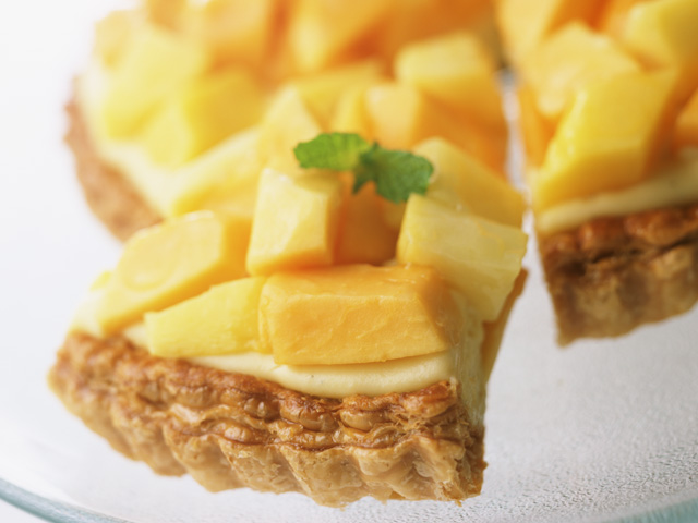 ココナツ風味のタルト生地に、バニラビーンズ入りのカスタードクリームと旬のマンゴーをのせて。